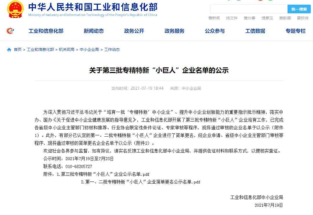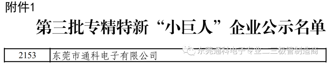 2021年7月19日,工业和信息化部第三批专精特新“小巨人”企业名单公示,东莞45家企业上榜,东莞市通科电子有限公司成功入选。